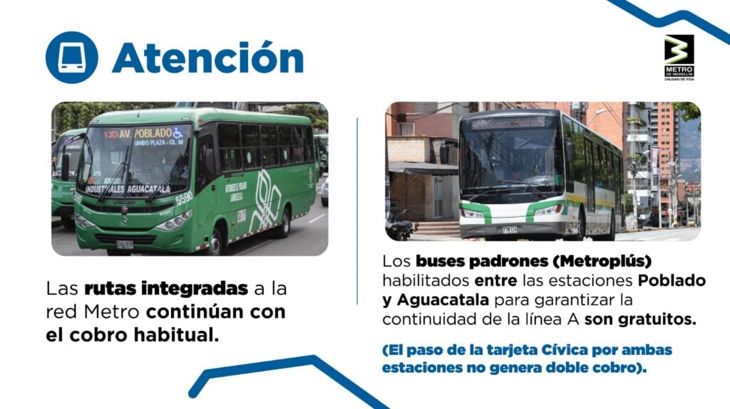 En cuanto al resto de la red, el Metro informó que las rutas integradas continúan funcionando con el cobro habitual. Es decir, los buses verdes que conectan los barrios y municipios del Valle de Aburrá con las estaciones del sistema seguirán operando normalmente, sin cambios en sus tarifas o frecuencias.