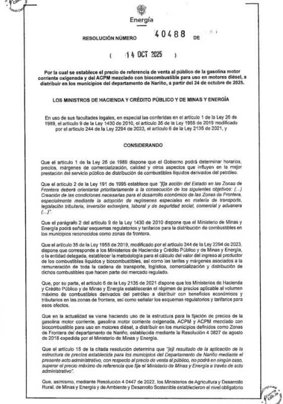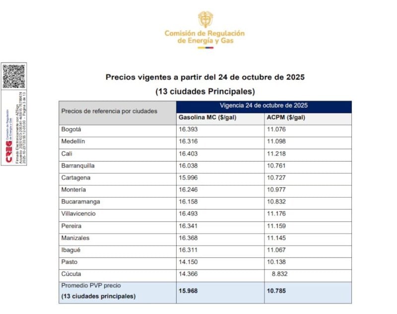La medida, establecida mediante la resolución 40488 del 14 de octubre y confirmada por la Comisión de Regulación de Energía y Gas (Creg), fija un aumento de 100 pesos por galón. De esta manera, el precio promedio de la gasolina en las 13 principales ciudades del país pasó de $15.868 a $15.968 pesos, mientras que el diésel subió de $10.685 a $10.785 pesos. En Bogotá, el valor del galón de gasolina quedó en $16.393 pesos.