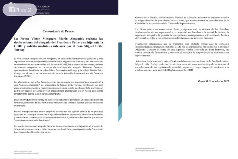 El pronunciamiento de Uribe Londoño coincidió con la respuesta emitida por la firma Víctor Mosquera Marín Abogados, que representa a la familia de la víctima. El despacho rechazó una denuncia presentada ante la Comisión Interamericana de Derechos Humanos (CIDH) por el abogado Alejandro Carranza, quien actúa como representante del presidente Petro y de su hijo Nicolás Petro.
