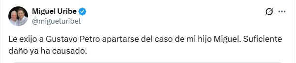 La solicitud fue hecha pública a través de su cuenta oficial en X, donde Uribe Londoño manifestó su inconformidad por las reiteradas declaraciones del jefe de Estado sobre el caso. “Le exijo a Gustavo Petro apartarse del caso de mi hijo Miguel. Suficiente daño ya ha causado”, escribió, señalando que las afirmaciones del mandatario interfieren en el proceso que actualmente lidera la Fiscalía General de la Nación.