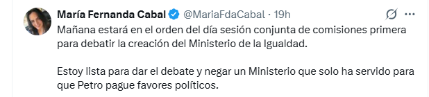 La senadora indicó que su bancada presentará argumentos para negar la iniciativa durante la sesión de las comisiones primeras, programada para este martes. En la agenda aparece la discusión del Proyecto de Ley 302 de 2025 en el Senado y 020 de 2025 en la Cámara, mediante el cual se pretende restablecer la creación del Ministerio de Igualdad y Equidad.