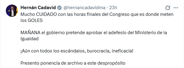 El representante Hernán Cadavid, del Centro Democrático, publicó una ponencia en la que solicita archivar el proyecto. Su posición se difundió en redes sociales, donde señaló que en las últimas jornadas del periodo legislativo suelen impulsarse iniciativas sin suficiente debate.