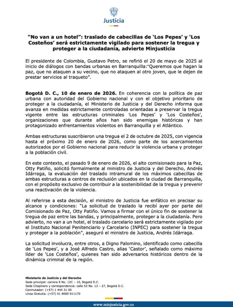 El Ministerio de Justicia y del Derecho confirmó que avanza en medidas estrictamente controladas para preservar la tregua vigente entre las estructuras criminales ‘Los Pepes’ y ‘Los Costeños’, en el marco de la política de paz urbana con autoridad impulsada por el Gobierno nacional. El anuncio fue realizado el 10 de enero de 2026 y tiene como objetivo prioritario proteger a la ciudadanía y evitar una reactivación de la violencia en Barranquilla y el Atlántico.