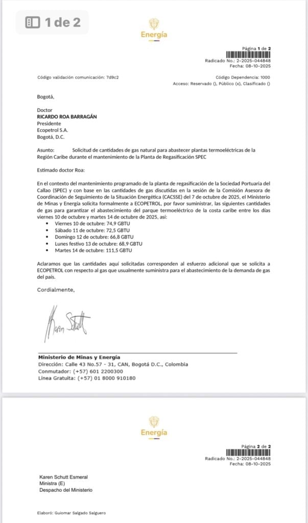 El Ministerio de Minas y Energía expidió una circular mediante la cual ordenó a seis compañías productoras de gas natural priorizar el suministro de este recurso a las plantas térmicas del Caribe colombiano, con el objetivo de garantizar la generación eléctrica durante el mantenimiento de la planta regasificadora de Cartagena, que se extenderá del 10 al 14 de octubre.