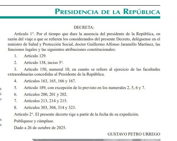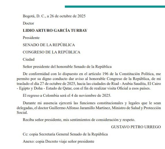 La designación fue oficializada a través de una comunicación enviada por la Casa de Nariño al Congreso de la República, en la que se notificó que Jaramillo ejercerá las responsabilidades constitucionales y legales del cargo durante la ausencia temporal del jefe de Estado. El documento señala que la gira presidencial busca fortalecer las relaciones diplomáticas y avanzar en acuerdos de cooperación con los tres países.