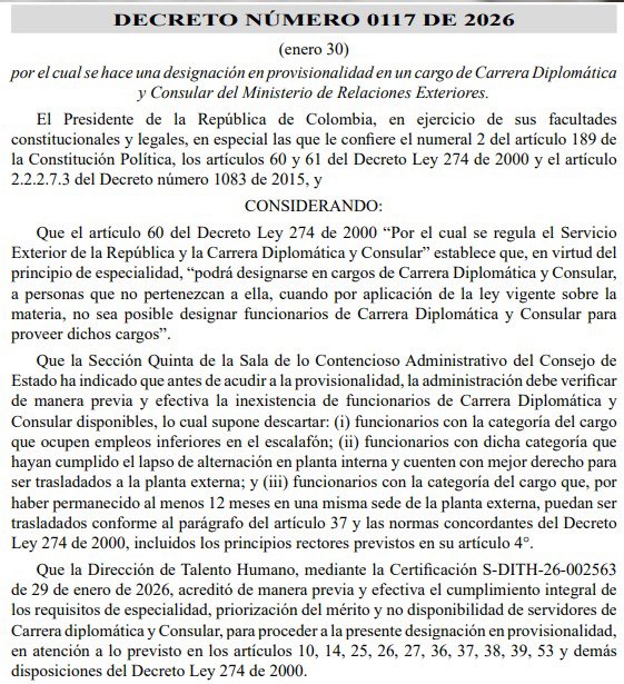 El presidente Gustavo Petro y la canciller Rosa Yolanda Villavicencio firmaron el decreto 0117 del 30 de enero de 2026 mediante el cual designaron en provisionalidad al exministro de la Igualdad Juan Carlos Florián Silva como segundo secretario de Relaciones Exteriores en el consulado de Colombia en Bruselas, Bélgica.