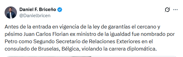 La designación fue divulgada públicamente por el exconcejal de Bogotá y candidato a la Cámara Daniel Briceño, quien cuestionó el nombramiento al señalar que el funcionario no pertenece a la carrera diplomática y consular. El señalamiento se suma a críticas recurrentes de sindicatos de la Cancillería sobre la asignación de cargos diplomáticos a personas externas al escalafón profesional.