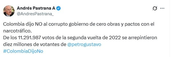 El expresidente Andrés Pastrana también intervino con un mensaje en el que aseguró que “Colombia dijo no al corrupto gobierno de cero obras y pactos con el narcotráfico”, recordando que de los más de 11 millones de votos obtenidos por Petro en la segunda vuelta de 2022, “diez millones de votantes se arrepintieron”.