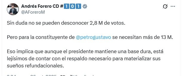 Por su parte, el representante a la Cámara Andrés Forero, del Centro Democrático, destacó que aunque el Pacto Histórico logró una base cercana a los 2,8 millones de votos, esa cifra está lejos de los más de 13 millones que serían necesarios para avanzar en la propuesta de una constituyente. “El presidente mantiene una base dura, pero está lejísimos de contar con el respaldo necesario para materializar sus sueños refundacionales”, escribió.