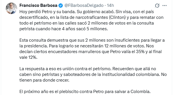 El exfiscal general de la Nación, Francisco Barbosa, también reaccionó de manera crítica y consideró que el resultado de la consulta es un mensaje claro sobre la pérdida de apoyo al presidente Petro. “Hoy perdió Petro y su banda. Su gobierno acabó”, expresó en redes sociales, asegurando que la diferencia de votos entre 2022 y 2024 muestra un retroceso significativo en la base electoral del oficialismo. Barbosa, además, vinculó su análisis con el contexto político internacional, al señalar que “sin visa, con el país descertificado y en la Lista Clinton, el petrismo apenas alcanzó dos millones de votos cuando antes logró cinco”.