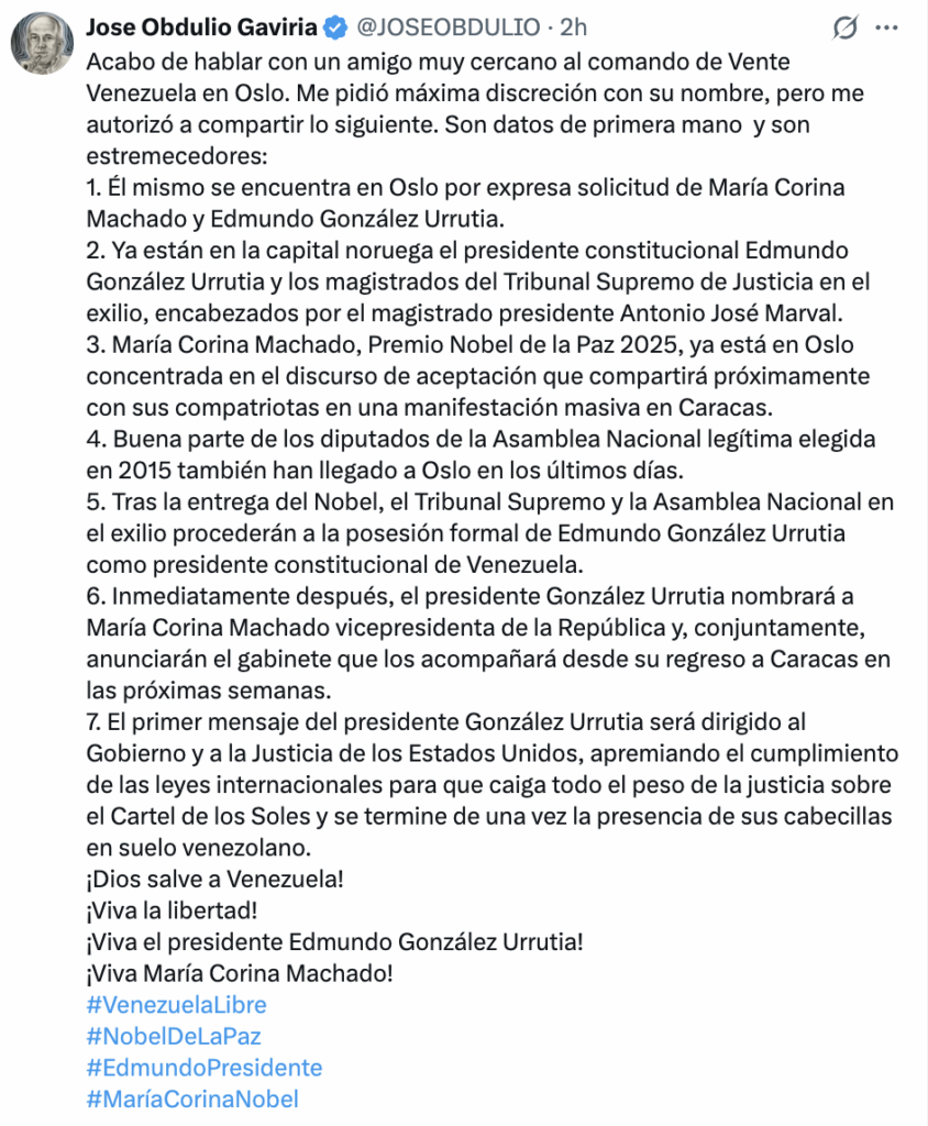 El panorama político venezolano volvió a agitarse tras un mensaje publicado por el analista político y dirigente del Centro Democrático, José Obdulio Gaviria, quien aseguró en la red X haber recibido información directa de un “amigo cercano” al comando de la organización opositora Vente Venezuela, presuntamente presente en Oslo, Noruega. Según Gaviria, las comunicaciones describen una serie de movimientos estratégicos de líderes opositores en ese país europeo, en vísperas de la entrega del Premio Nobel de la Paz 2025 a María Corina Machado, reconocimiento anunciado meses atrás por el comité organizador.