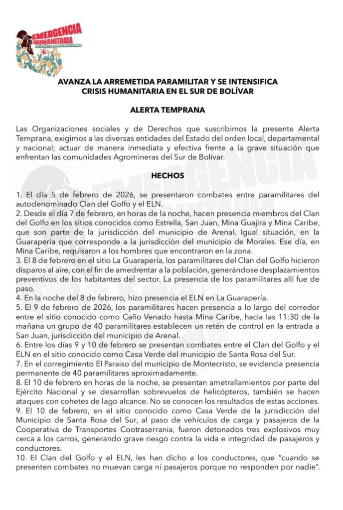 De acuerdo con lo expresado, los combates comenzaron el jueves de la primera semana de este mes entre paramilitares del autodenominado Clan del Golfo y el ELN. Posteriormente, se hizo una lista de hechos violentos, iniciando con unos hechos ocurridos la noche del 7 de febrero, donde, al parecer, miembros del Clan del Golfo hicieron presencia en zonas como Estrella, San Juan, Mina Guajira y Mina Caribe, en el municipio de Arenal, así como en La Guarapería, del municipio de Morales, y que en Mina Caribe, los paramilitares requisaron a los hombres que encontraron en la zona.