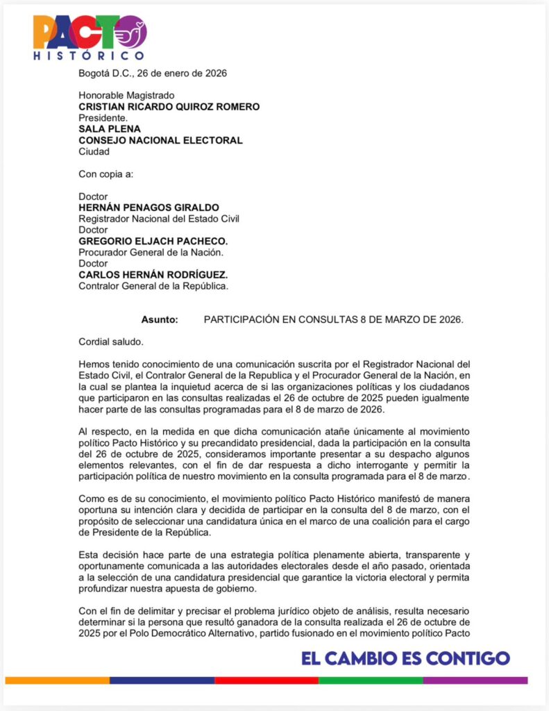 La misiva se da luego del comunicado conjunto entre la Registraduría Nacional del Estado Civil, la Contraloría General de la República y la Procuraduría General de la Nación, en el cual plantean la inquietud acerca de si las organizaciones políticas y los ciudadanos que participaron en las consultas realizadas el 26 de octubre de 2025 pueden igualmente hacer parte de las consultas programadas para el 8 de marzo de 2026.