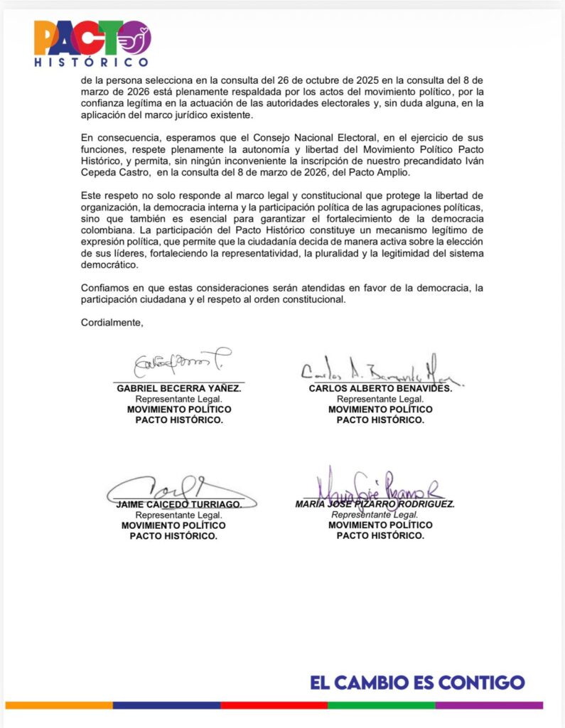 El Pacto Histórico envió una comunicación formal al tribunal electoral en la que solicitó claridad jurídica frente a la posibilidad de que Iván Cepeda haga parte de la consulta presidencial del Frente Amplio del próximo 8 de marzo.