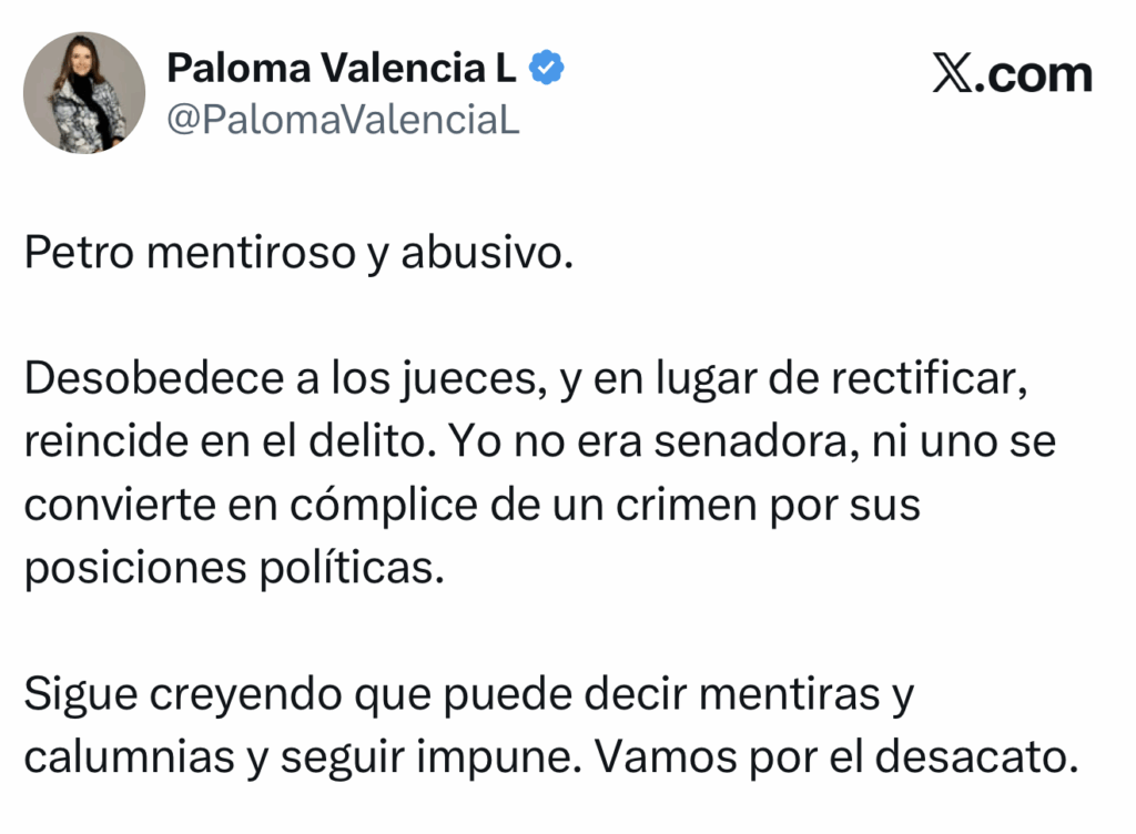 El mensaje publicado por Petro en su cuenta de X provocó una nueva controversia. Aunque el presidente aseguró estar cumpliendo con la sentencia, el contenido del texto no solo reitera críticas hacia Valencia, sino que intenta justificar su acusación original bajo la figura de una supuesta “responsabilidad política”, lo que para la senadora constituye una reincidencia en la misma conducta que motivó el fallo judicial.