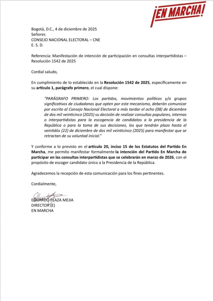 El oficio, firmado por Eduardo Plaza Mejía, director (e) de la colectividad, precisa que, conforme a los estatutos internos, el partido ha decidido avanzar en este mecanismo democrático. En la comunicación, Plaza Mejía expresa formalmente “la intención del Partido En Marcha de participar en las consultas interpartidistas que se celebrarán en marzo de 2026, con el propósito de escoger candidato único a la Presidencia de la República”.