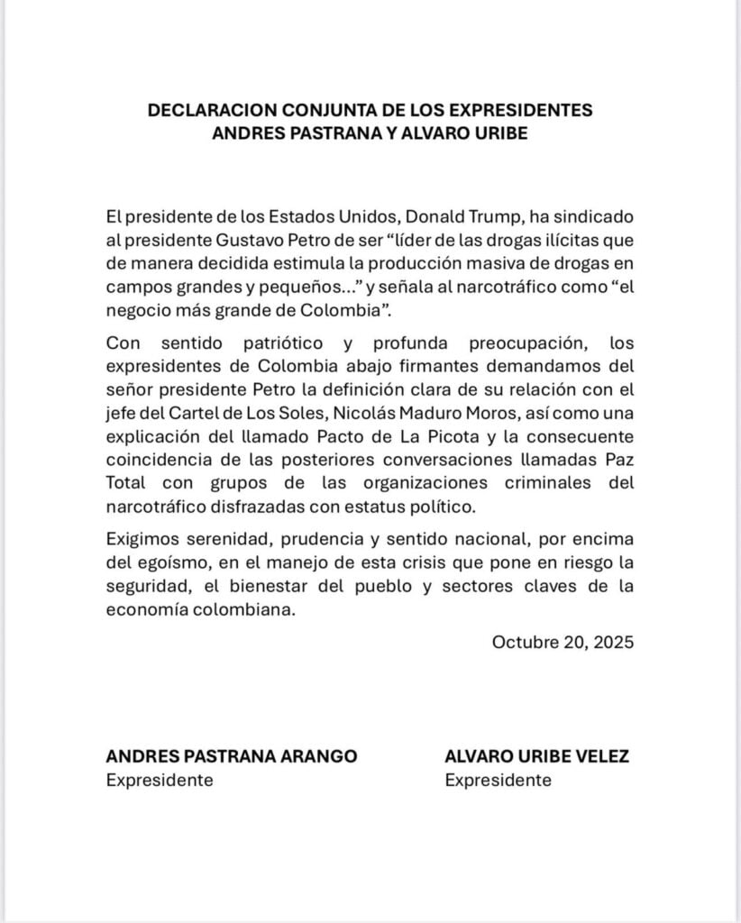 Los expresidentes Andrés Pastrana Arango y Álvaro Uribe Vélez emitieron una declaración conjunta este 20 de octubre de 2025, en la que expresaron su “sentido patriótico y profunda preocupación” frente a las recientes afirmaciones del expresidente de Estados Unidos, Donald Trump, contra el mandatario colombiano Gustavo Petro.