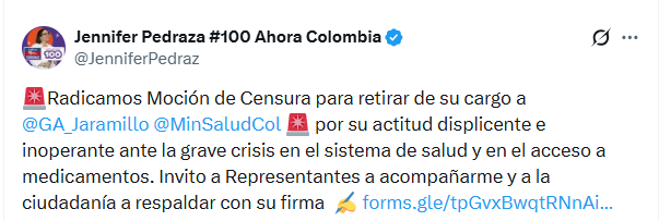 La iniciativa fue presentada por la representante Jennifer Pedraza y, según se informó, cuenta con el respaldo de más de diez congresistas. El documento fue radicado ante la Mesa Directiva de la Corporación y solicita apartar del cargo al jefe de la cartera de Salud, en el marco del mecanismo de control político contemplado en la Constitución.