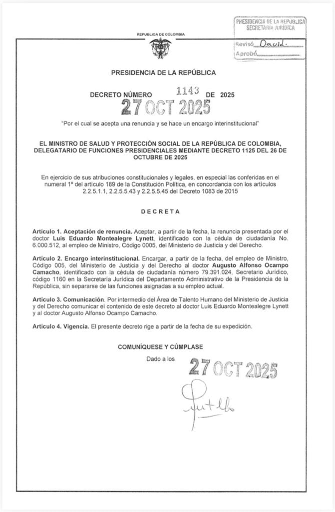 El presidente de la República, Gustavo Petro Urrego, aceptó la renuncia del ministro de Justicia y del Derecho, Luis Eduardo Montealegre Lynett, mediante el Decreto 1143 del 27 de octubre de 2025, firmado por el ministro de Salud y Protección Social en su calidad de delegatario de funciones presidenciales.
