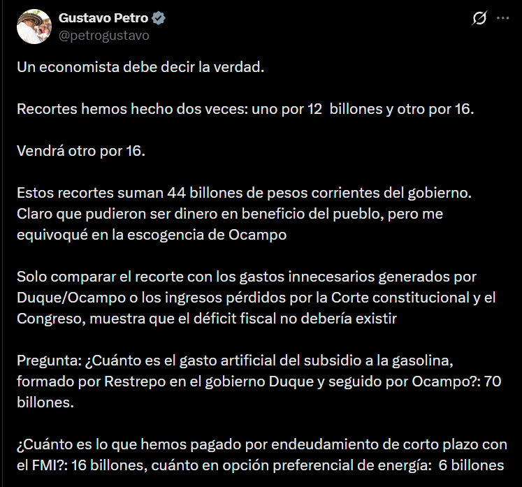 El presidente Gustavo Petro se pronunció por medio de su cuenta de X sobre la política fiscal y los recortes presupuestales realizados por su gobierno, argumentando que las medidas han sido necesarias para controlar el déficit fiscal.