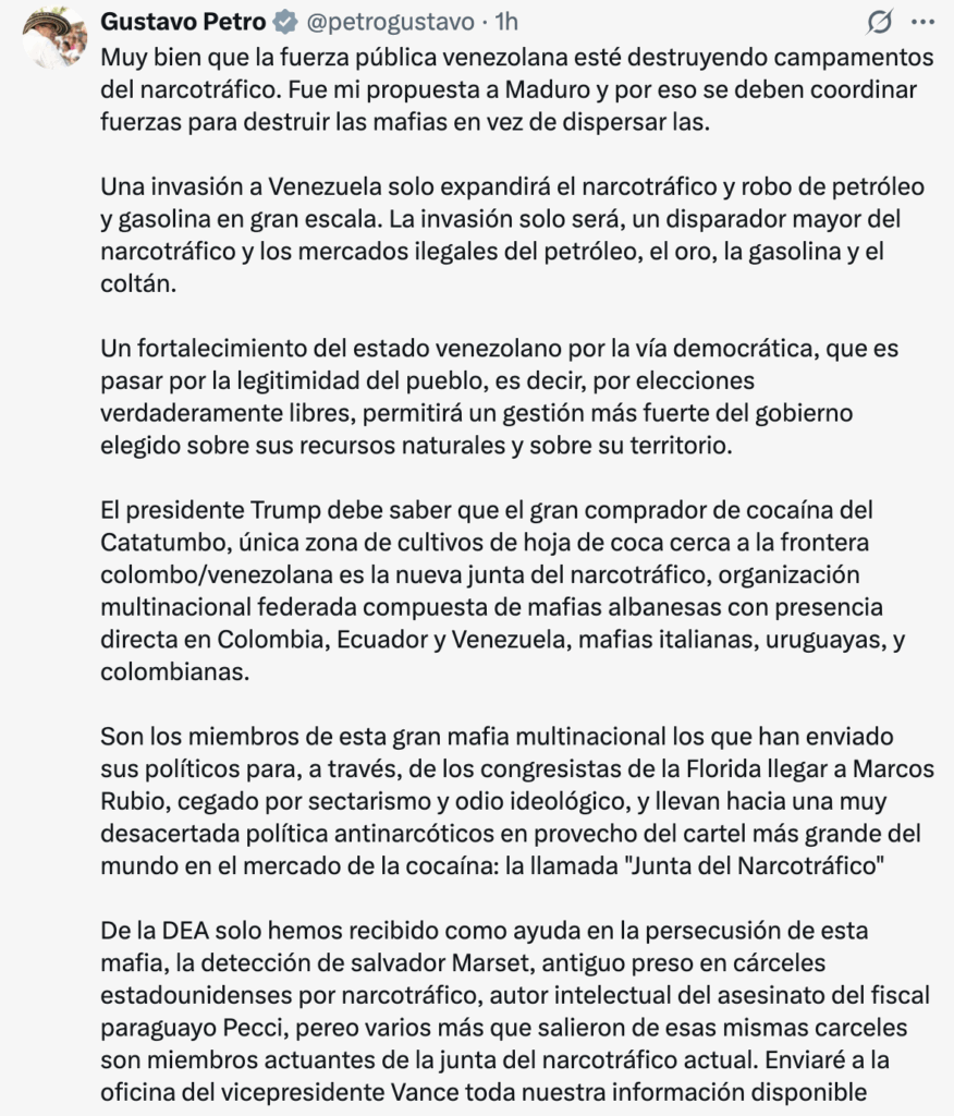 El mandatario también se refirió a la actividad de las organizaciones criminales en la región fronteriza, señalando que según él, la “Junta del Narcotráfico” opera como una organización multinacional integrada por mafias albanesas, italianas, uruguayas y colombianas con presencia en Colombia, Ecuador y Venezuela. Sobre este grupo, Petro indicó: “El presidente Trump debe saber que el gran comprador de cocaína del Catatumbo, única zona de cultivos de hoja de coca cerca a la frontera colombo/venezolana, es la nueva junta del narcotráfico, organización multinacional federada compuesta de mafias albanesas con presencia directa en Colombia, Ecuador y Venezuela, mafias italianas, uruguayas, y colombianas”.