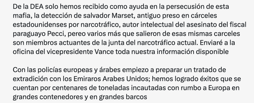 El presidente explicó que la DEA ha facilitado información limitada en la persecución de estas mafias, mencionando el caso de Salvador Marset, antiguo preso en Estados Unidos vinculado al asesinato del fiscal paraguayo Pecci. “De la DEA solo hemos recibido como ayuda en la persecusión de esta mafia, la detección de Salvador Marset, antiguo preso en cárceles estadounidenses por narcotráfico, autor intelectual del asesinato del fiscal paraguayo Pecci, pero varios más que salieron de esas mismas cárceles son miembros actuantes de la junta del narcotráfico actual. Enviaré a la oficina del vicepresidente Vance toda nuestra información disponible”, dijo Petro.
