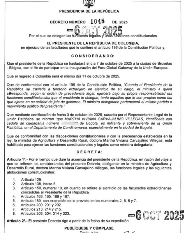 El presidente Gustavo Petro delegó temporalmente sus funciones constitucionales y administrativas en la ministra de Agricultura y Desarrollo Rural, Martha Viviana Carvajalino Villegas, mientras cumple una agenda internacional en Bruselas, Bélgica, entre el 7 y el 11 de octubre de 2025.