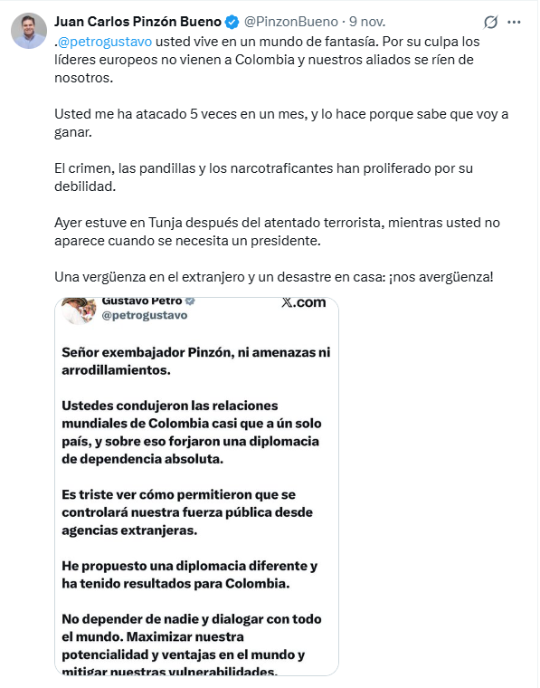 El presidente Gustavo Petro y el precandidato Juan Carlos Pinzón, protagonizaron un nuevo intercambio de declaraciones a través de X este 9 de noviembre, centrado en la política exterior del país y las relaciones con EE. UU.