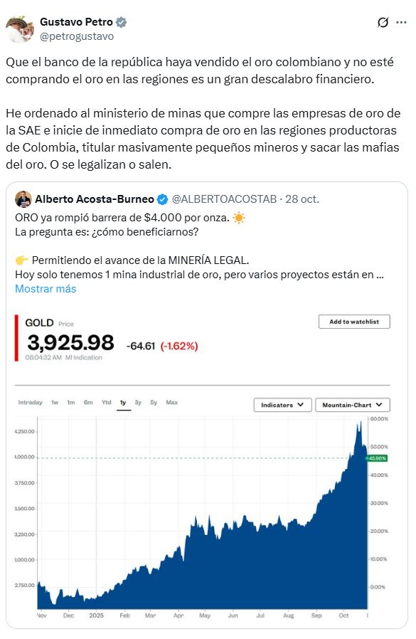 El mandatario señaló que la medida busca titular a pequeños mineros y promover la formalización del sector. En su publicación afirmó que con la compra directa se pretende retirar del negocio a las estructuras ilegales que controlan parte de la extracción y comercialización del mineral. “He ordenado al Ministerio de Minas que compre las empresas de oro de la SAE e inicie de inmediato la compra de oro en las regiones productoras de Colombia, titular masivamente pequeños mineros y sacar las mafias del oro. O se legalizan o salen”, escribió Petro.