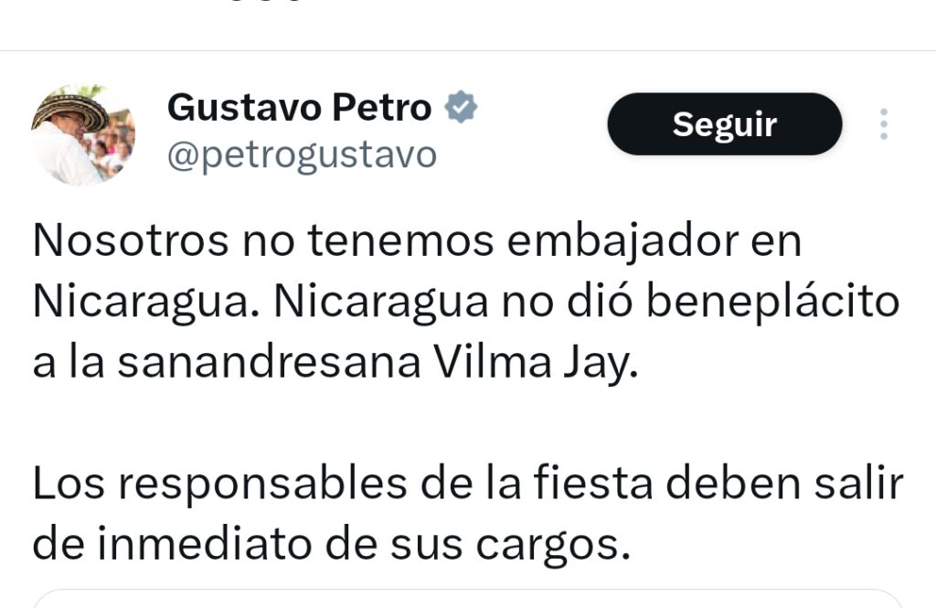 El pronunciamiento del mandatario se dio a través de su cuenta en X, donde además aclaró la situación diplomática entre Colombia y Nicaragua. Petro señaló que actualmente Colombia no cuenta con embajador en Managua, al precisar que el Gobierno nicaragüense no otorgó el beneplácito a Vilma Jay, periodista sanandresana postulada para ocupar ese cargo.