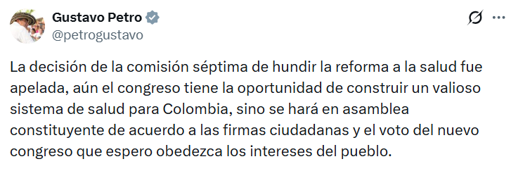 El presidente reiteró que la reforma presentada por su Gobierno buscaba fortalecer un enfoque preventivo y territorial de la atención en salud. Según expresó, la iniciativa fue bloqueada por sectores políticos que, en su criterio, mantienen intereses en la privatización del sistema. Tras el archivo del proyecto, recordó que la decisión de la Comisión Séptima fue apelada, por lo que el trámite aún podría retomarse en el Congreso.
