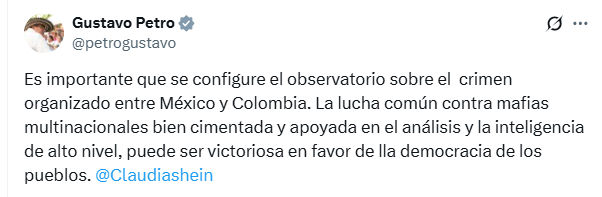 “Es importante que se configure el observatorio sobre el crimen organizado entre México y Colombia”, escribió Petro en su publicación, en la que añadió que la “lucha común contra mafias multinacionales, bien cimentada y apoyada en el análisis y la inteligencia de alto nivel, puede ser victoriosa en favor de la democracia de los pueblos”.