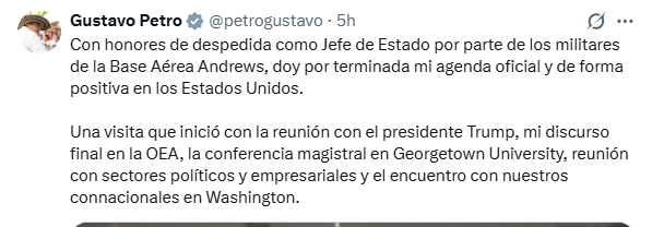 El presidente Gustavo Petro confirmó su regreso a Colombia luego de finalizar su visita oficial a Estados Unidos, donde cumplió una agenda diplomática con reuniones con autoridades de ese país. A través de un mensaje público, el mandatario informó que su salida se realizó con honores militares en la Base Aérea Andrews y dio por terminada su actividad internacional.