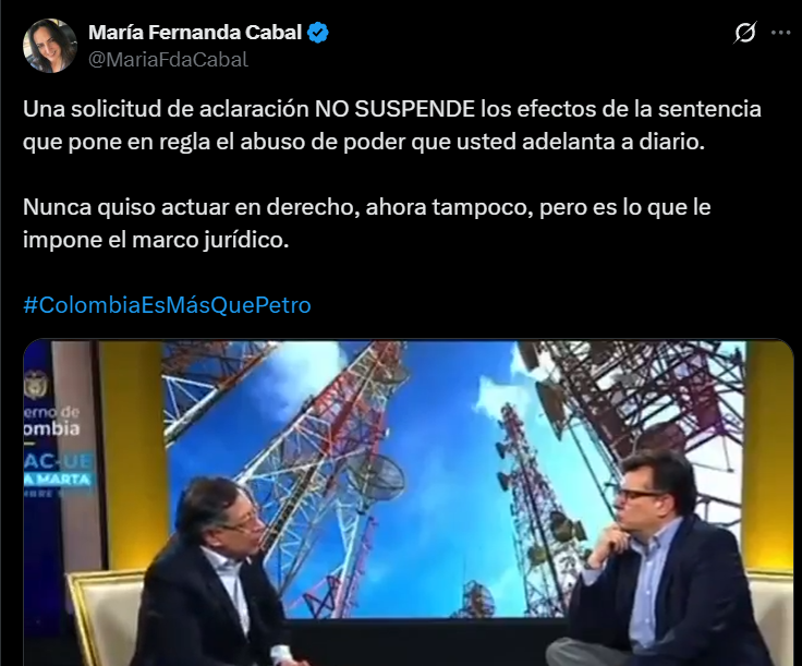 Una de las voces más notorias fue la de María Fernanda Cabal. La senadora escribió en sus redes que, “una solicitud de aclaración NO SUSPENDE los efectos de la sentencia que pone en regla el abuso de poder que usted adelanta a diario”, dirigiéndose al presidente, para luego explicar que este nunca quiso actuar en derecho, y que “ahora tampoco”, pero que era lo que imponía el marco jurídico.