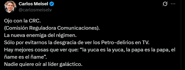 “Gustavo Petro, una vez más, incumplió: anunció alocución presidencial, pero no apareció a tiempo en la señal pública y ahora es blanco de críticas”, fue otro de los comentarios que se leyó en X, de igual forma, el senador Carlos Meisel comentó también en la red social lo siguiente: “ojo con la Comisión Reguladora Comunicaciones, que califica como “la nueva enemiga del régimen”, a causa de evitar “la desgracia de ver los Petro-delirios en TV”.