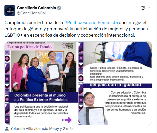 La iniciativa da continuidad a un proceso iniciado en 2025 bajo la gestión de la entonces canciller Laura Sarabia, y ubica al país dentro del grupo de naciones que han incorporado este enfoque en su política exterior, entre ellas Suecia, Francia, España, México y Chile.