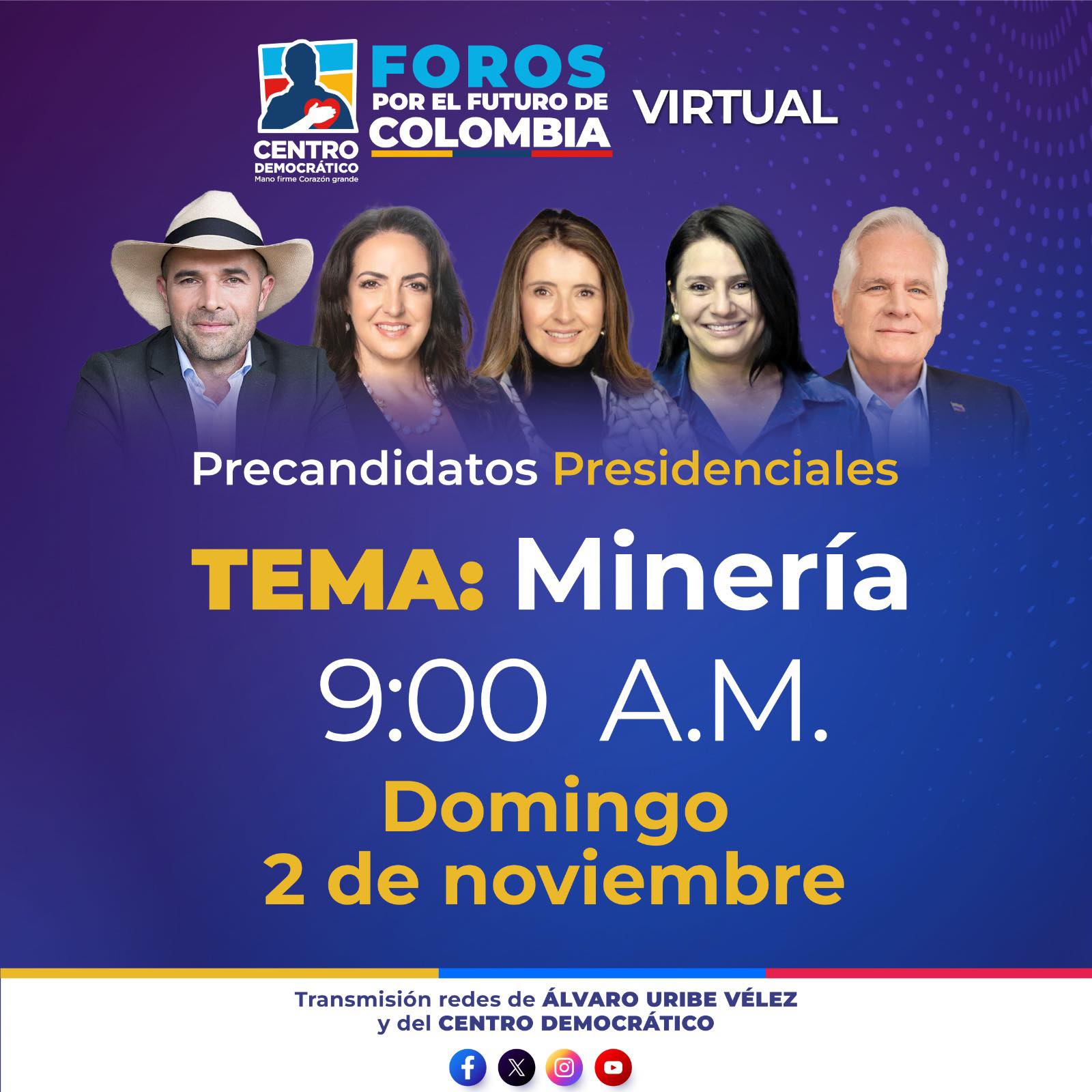 En el foro “Energía y Minería: el futuro de Colombia”, realizado hoy en Boyacá, los precandidatos presidenciales del Centro Democrático expusieron sus propuestas para el desarrollo del sector minero. El evento, liderado por el expresidente Álvaro Uribe Vélez, se centró en la necesidad de reactivar la minería legal, enfrentar la minería ilegal con tecnología y fuerza especializada, y recuperar la soberanía energética del país.