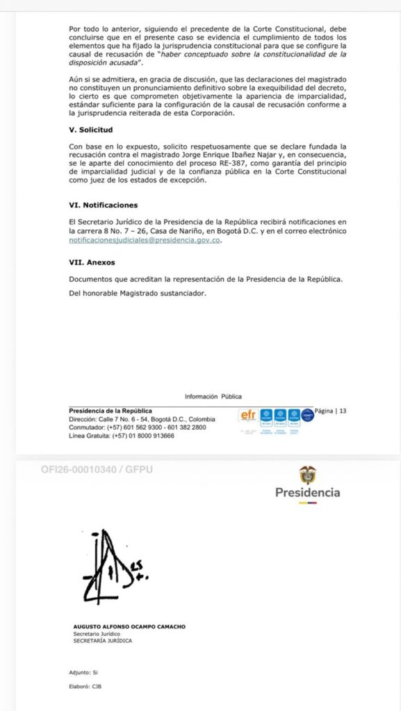 En la parte resolutiva, la Presidencia solicita que se declare fundada la recusación y que Ibáñez Najar sea separado del conocimiento del proceso. “Solicito respetuosamente que se declare fundada la recusación contra el magistrado Jorge Enrique Ibáñez Najar y, en consecuencia, se le aparte del conocimiento del proceso RE-387, como garantía del principio de imparcialidad judicial y de la confianza pública en la Corte Constitucional como juez de los estados de excepción”, se lee en el documento.