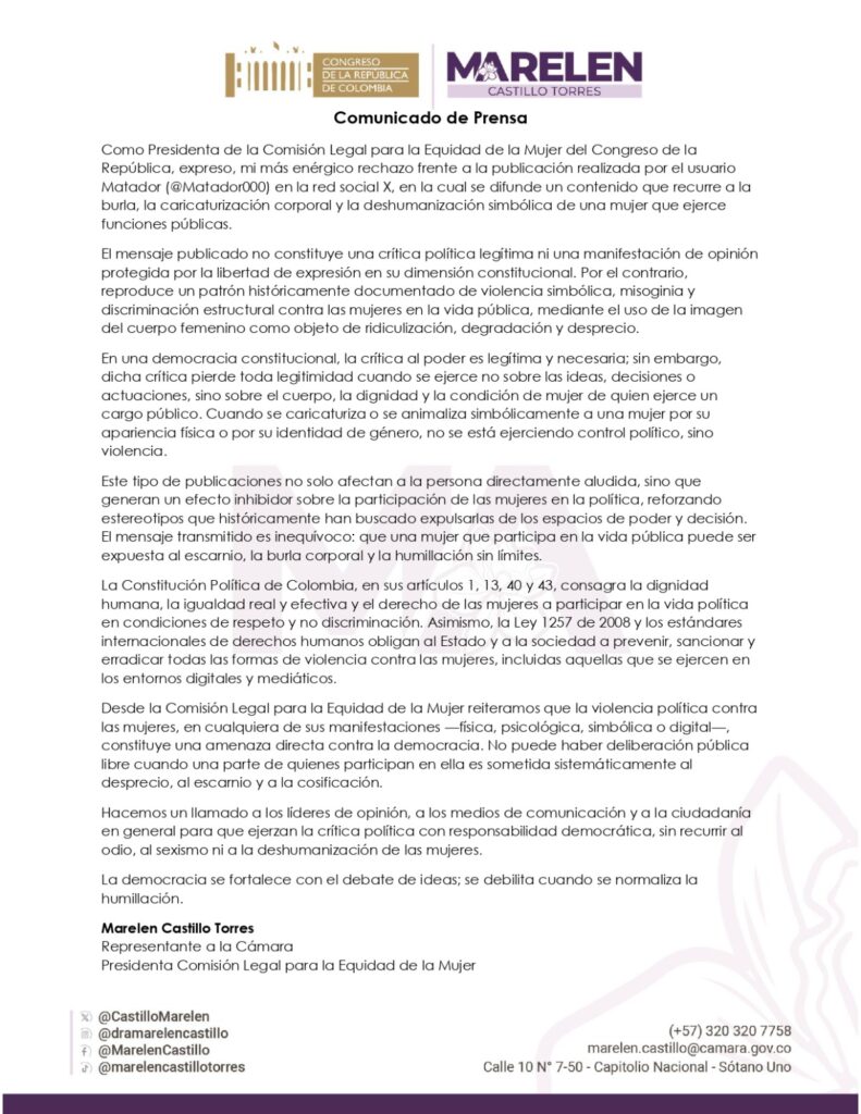 Finalmente, desde la Comisión Legal para la Equidad de la Mujer, reiteró que la violencia política contra las mujeres, en cualquiera de sus manifestaciones —física, psicológica, simbólica o digital—, constituye una amenaza directa contra la democracia. En el cierre del comunicado, hizo un llamado a líderes de opinión, medios de comunicación y ciudadanía para ejercer la crítica política con responsabilidad democrática, sin recurrir al odio, el sexismo ni la deshumanización, al tiempo que afirmó que “la democracia se fortalece con el debate de ideas; se debilita cuando se normaliza la humillación”.