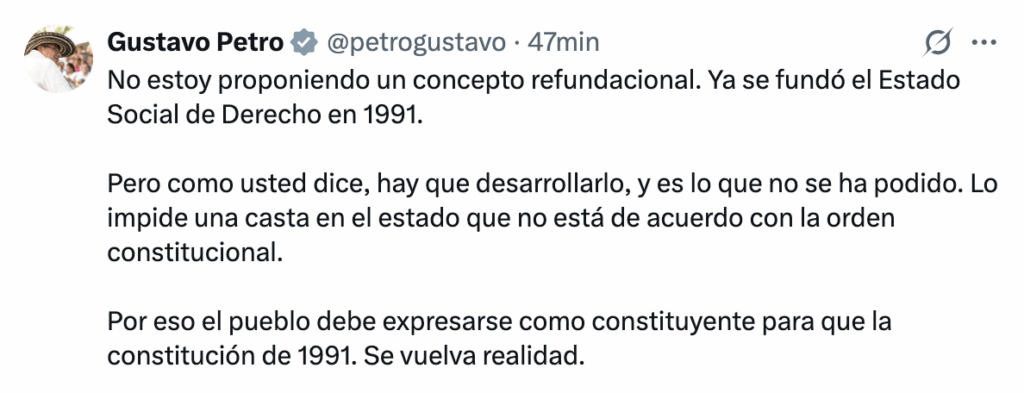 Minutos antes, el mandatario había hecho una intervención en la que descartó que la propuesta tenga un carácter “refundacional” del Estado. “No estoy proponiendo un concepto refundacional. Ya se fundó el Estado Social de Derecho en 1991”, afirmó Petro, subrayando que su propósito es avanzar en el desarrollo de los principios establecidos en la Constitución vigente.