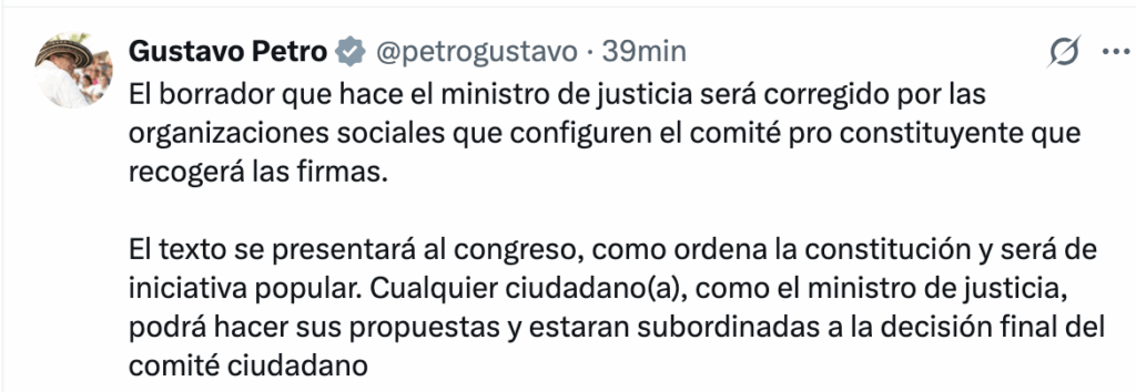 “El borrador que hace el ministro de Justicia será corregido por las organizaciones sociales que configuren el comité pro constituyente que recogerá las firmas”, señaló el presidente Petro al referirse a la metodología de trabajo que se implementará en torno a la iniciativa. Según explicó, este comité tendrá la responsabilidad de consolidar el documento final que se presentará ante el Congreso de la República.