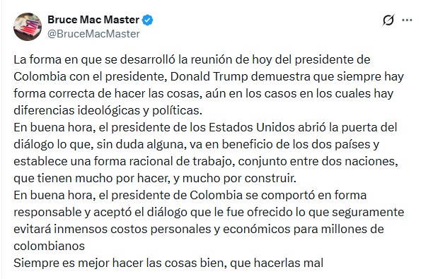 Dirigentes gremiales y figuras políticas se pronunciaron sobre el alcance del diálogo entre ambos gobiernos y el impacto en la relación bilateral. El presidente de la Asociación Nacional de Empresarios de Colombia (ANDI), Bruce Mac Master, afirmó que la reunión evidencia la importancia de mantener canales diplomáticos activos incluso en escenarios de diferencias políticas.