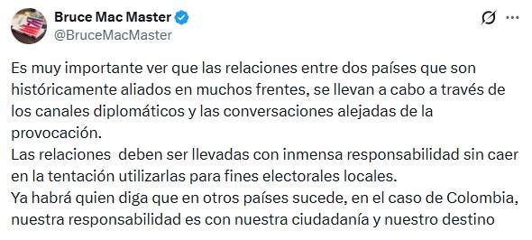 En un segundo pronunciamiento, enfatizó que las relaciones entre Estados deben gestionarse con prudencia institucional y no convertirse en instrumentos de disputas políticas internas. Agregó que, en el caso colombiano, la prioridad debe ser la estabilidad de la relación bilateral y la protección de los intereses de la ciudadanía, por encima de debates electorales.