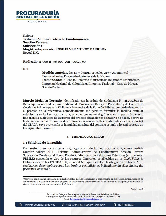 La Procuraduría General de la Nación elevó ante el Tribunal Administrativo de Cundinamarca una solicitud de medida cautelar para suspender los desembolsos económicos del convenio suscrito por el Fondo Rotatorio del Ministerio de Relaciones Exteriores con la Imprenta Nacional de Colombia y la empresa portuguesa Imprensa Nacional – Casa da Moeda S.A., en el marco del proyecto de modernización y personalización de pasaportes y documentos de viaje.