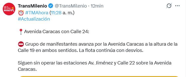 La concentración de manifestantes, reportada principalmente en la calle 24 con carrera 7 (Avenida Caracas), generó desvíos y congestión vehicular en la zona, lo que obligó a suspender temporalmente la operación en estaciones clave y a desviar articulados para reorganizar la circulación.