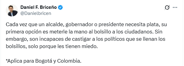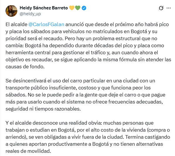 Expresó que esta decisión se da después de que la reforma tributaria del Distrito no fuera aprobada y reiteró críticas al incremento del costo del pico y placa solidario. Aseguró que los conductores ya asumen múltiples pagos como la sobretasa a la gasolina, el impuesto vehicular y los valores asociados a la movilidad, por lo que cuestionó la carga adicional.