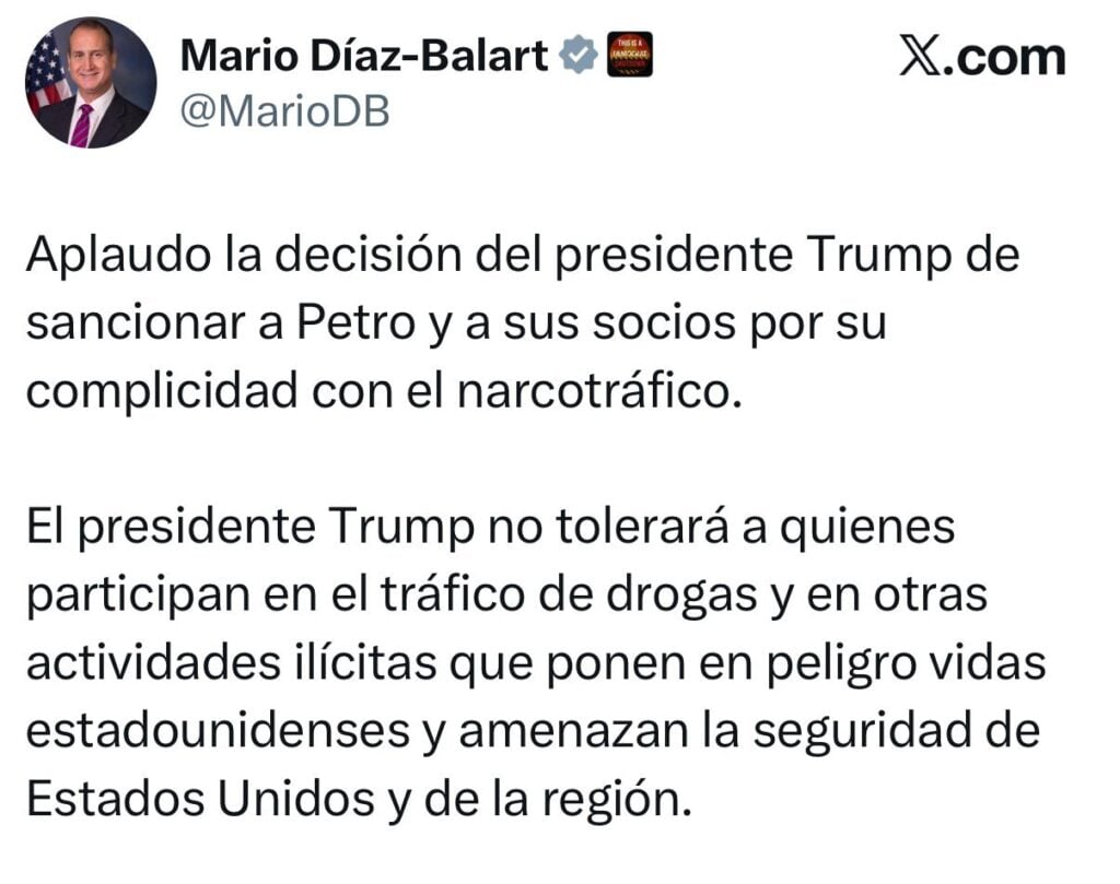 En Estados Unidos, varios congresistas republicanos respaldaron la decisión. El representante Mario Díaz-Balart aseguró que “aplaude” las sanciones impuestas por el gobierno de Trump y las consideró una medida necesaria ante lo que calificó como una “grave amenaza” para la seguridad hemisférica.