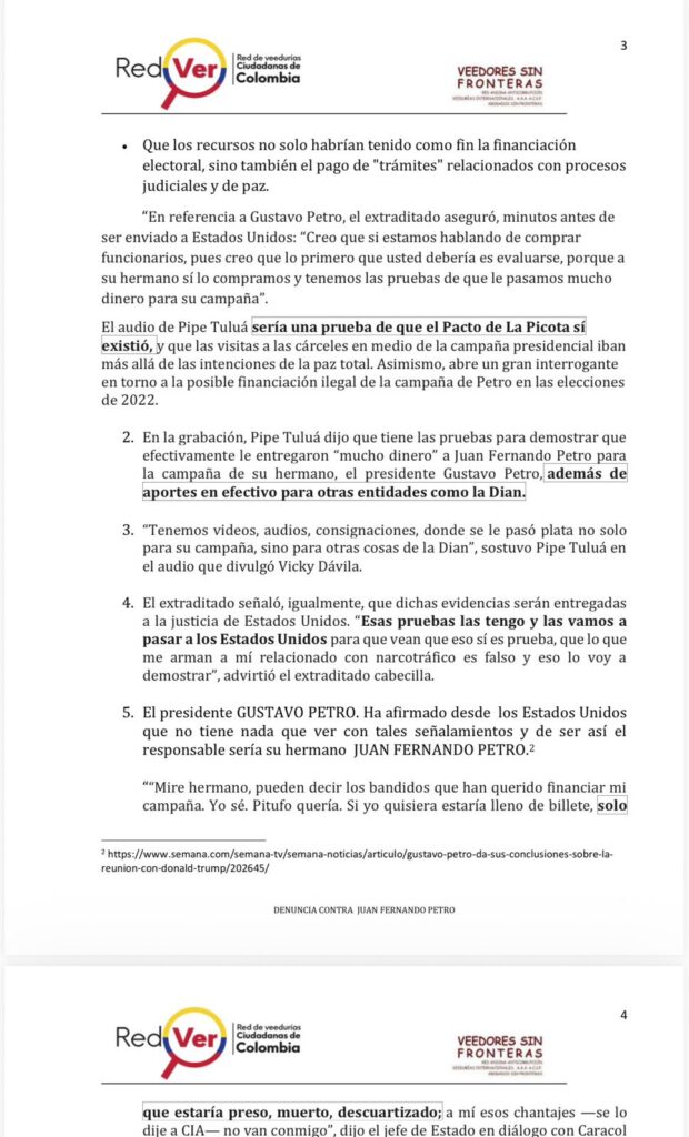 La denuncia también recoge pronunciamientos del presidente Gustavo Petro, quien desde Estados Unidos aseguró que no tiene relación con los señalamientos y que, de existir responsabilidad, esta recaería en su hermano Juan Fernando Petro. “Mire hermano, pueden decir los bandidos que han querido financiar mi campaña. Yo sé. Pitufo quería. Si yo quisiera estaría lleno de billete”, afirmó el jefe de Estado, según se cita.