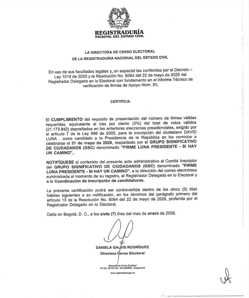 La Registraduría Nacional del Estado Civil certificó el cumplimiento del requisito legal de firmas para la inscripción de David Luna como candidato a la Presidencia de la República, con lo cual quedó formalmente habilitado para participar en la contienda electoral. La decisión fue notificada este 8 de enero de 2026, tras el proceso de revisión y validación de los apoyos ciudadanos presentados por el movimiento que respalda su aspiración.