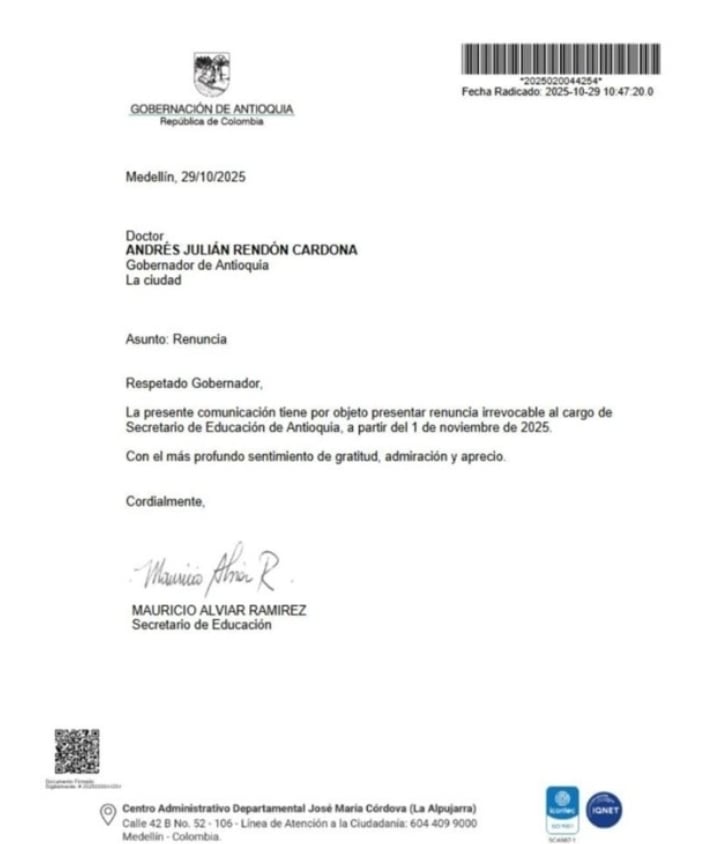 El secretario de Educación de Antioquia, Mauricio Alviar Ramírez, presentó su renuncia irrevocable al cargo ante el gobernador Andrés Julián Rendón Cardona, mediante una carta fechada el 29 de octubre de 2025.